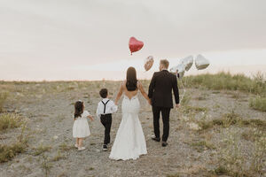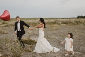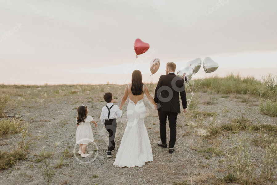 Asian bride and caucasian groom with heart-shaped balloon holding hands together while walking in field near daughter during daytime