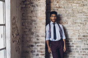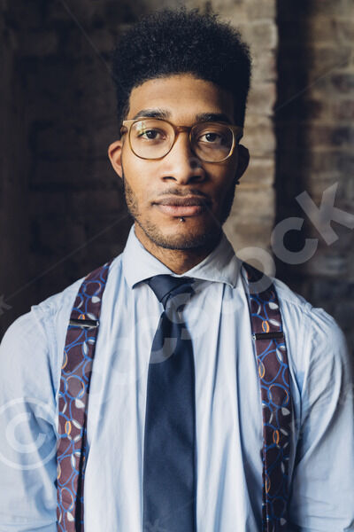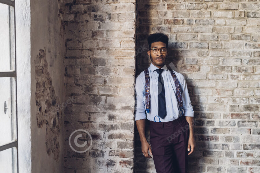 Mixed-race businessman wearing eyeglasses and suspender standing against brick wall in office