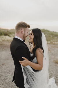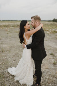 Asian bride and caucasian groom looking at each other while hugging and standing in a field during daytime