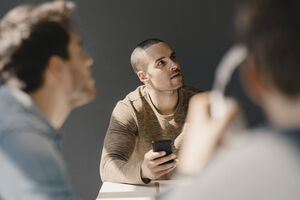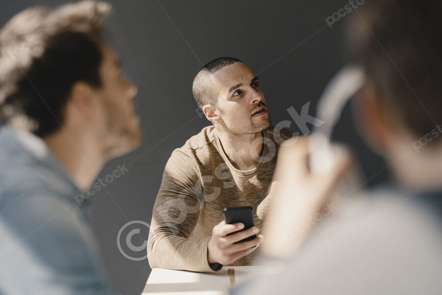 Middle Eastern man holding smartphone looking up while sitting at table near friends in office