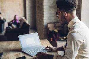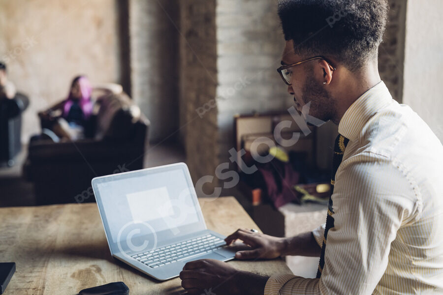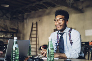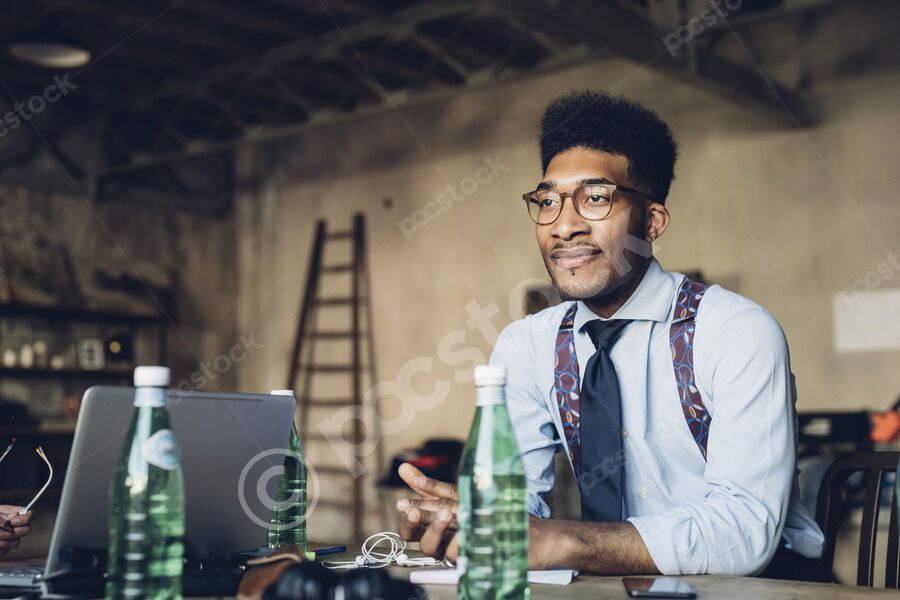 Mixed-race businessman wearing eyeglasses looking away sitting at table in office