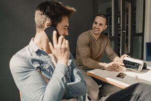 Middle Eastern man holding VR headset while talking to caucasian male friend sitting at table in office