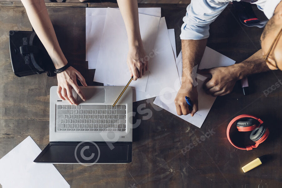 Mixed-race business woman wearing eyeglasses holding documents giving high five to caucasian male coworker while sitting in office