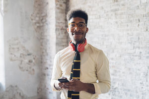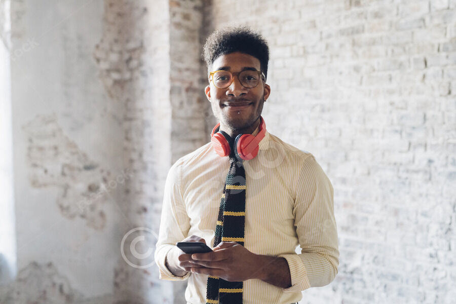 Mixed-race businessman with headphones wearing eyeglasses holding smartphone while standing in office