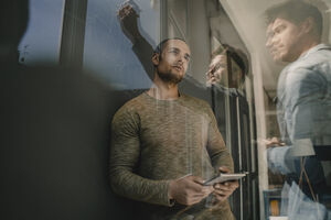 Middle Eastern man holding tablet looking away leaning against wall while standing behind glass window in office