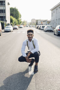Mixed-race man wearing eyeglasses crouching on city street on sunny day