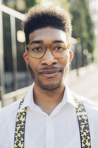 Mixed-race businessman wearing eyeglasses and suspender standing in office