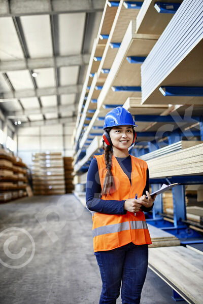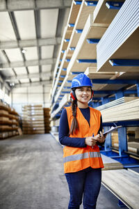 Asian female worker wearing vest and hard hat holding clipboard while standing near shelves with stacked wood panels in warehouse