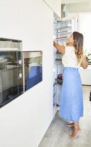 Hispanic woman looking away while sitting in bathtub in bathroom at home