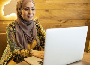 Black woman with dreadlocks using laptop sitting on platform at the train station