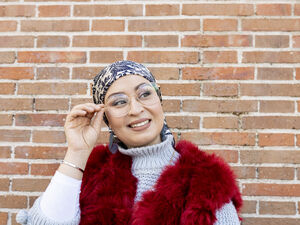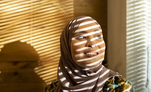 Black woman looking sideways standing in between curtains by the window