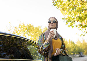 Black woman with dreadlocks wearing sunglasses looking away holding smoothie drink while sitting at table in cafe