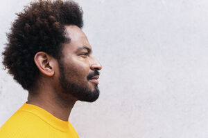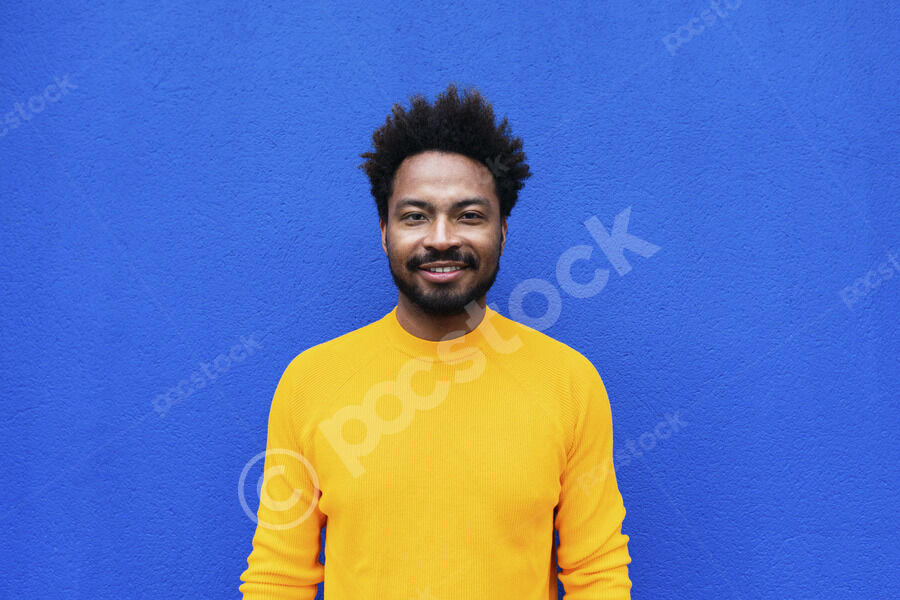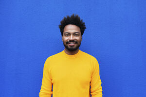 Smiling Hispanic man wearing yellow sweatshirt standing against blue background in studio