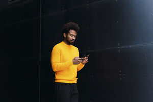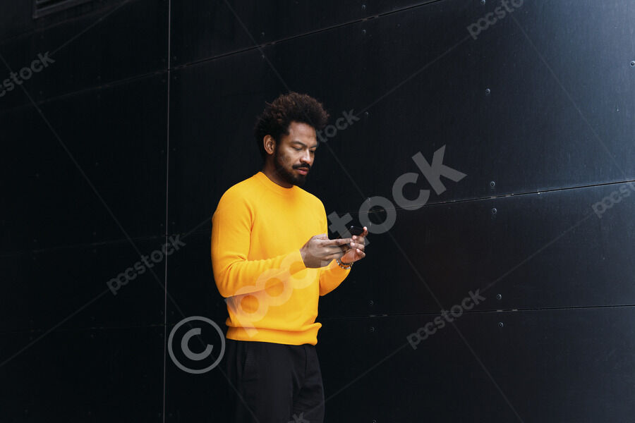 Hispanic man looking away holding smartphone standing against black wall outdoors