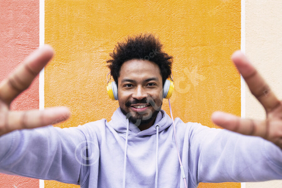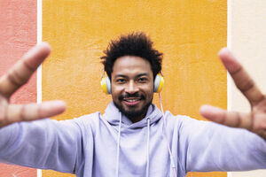 Smiling Hispanic man listening to music with headphones with arms raised standing in front of colorful wall