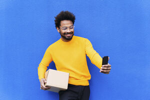 Smiling Hispanic man wearing eyeglasses holding box while taking selfie standing against wall