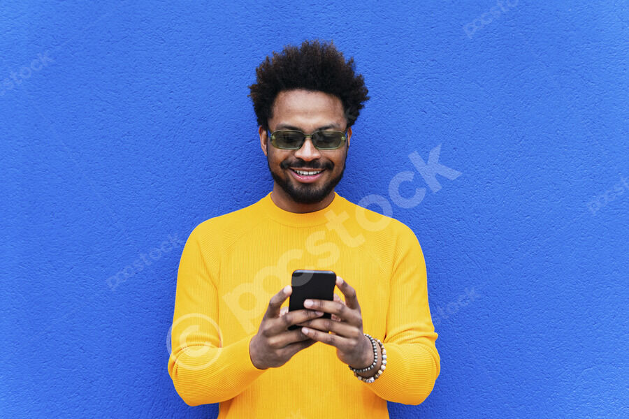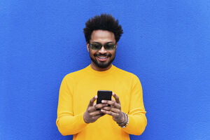 Smiling Hispanic man wearing sunglasses using smartphone standing againstblue background in studio