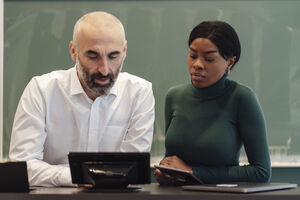 Middle Eastern male professor with beard working on tablet with Black female coworker while standing at table against blackboard in classroom
