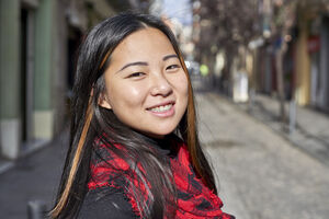 Black man holding plastic cup while caucasian girlfriend pouring wine during lunch date on balcony at home