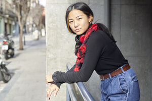 Black man standing on balcony looking at caucasian girlfriend showing him house keys at home