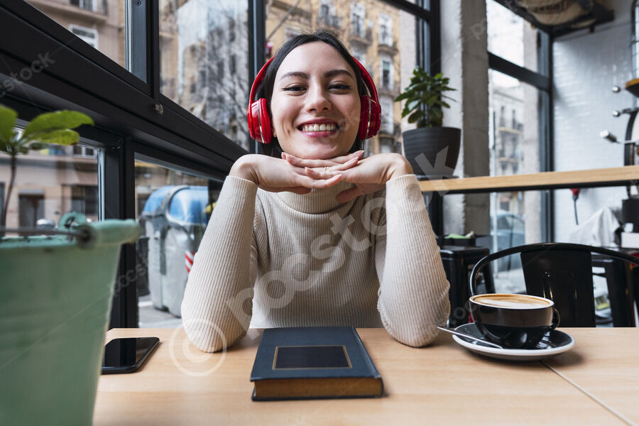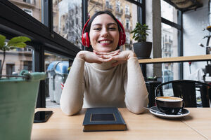 Smiling mixed-race woman with hand on chin listening music through headphones sitting at table in cafe