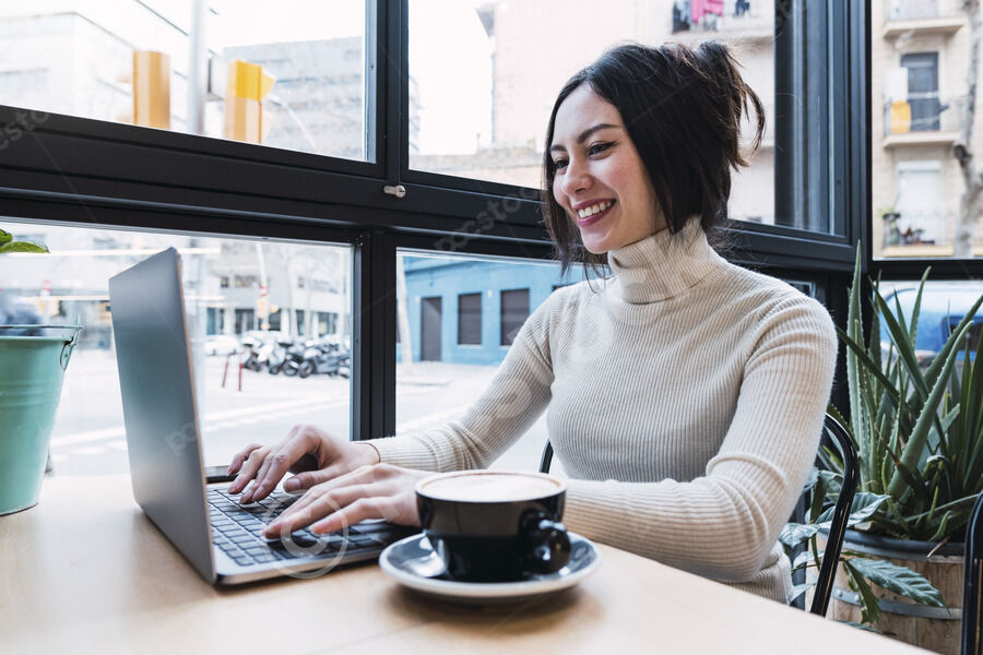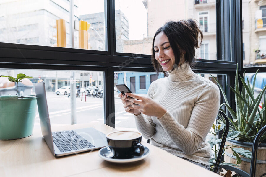 Smiling mixed-race woman using smartphone sitting at table with laptop and coffee in cafe