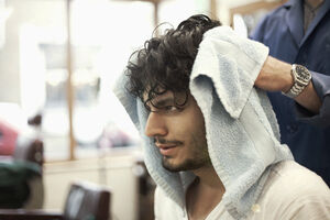 Black man with afro looking away while standing in front of green plant wall