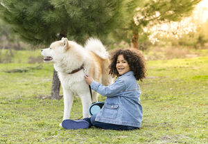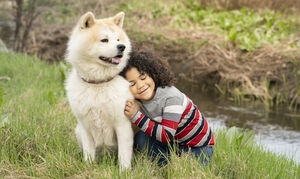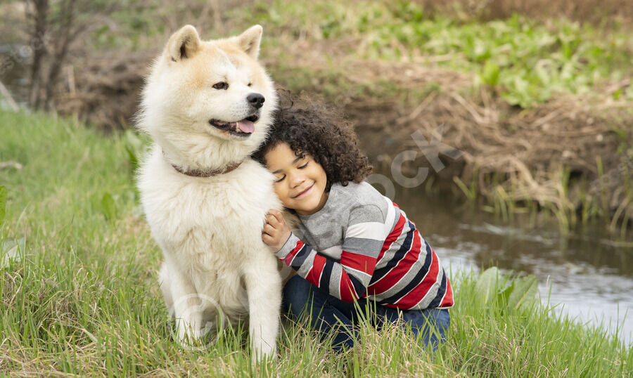 Smiling Hispanic boy with curly hair looking away while leaning on dog in nature