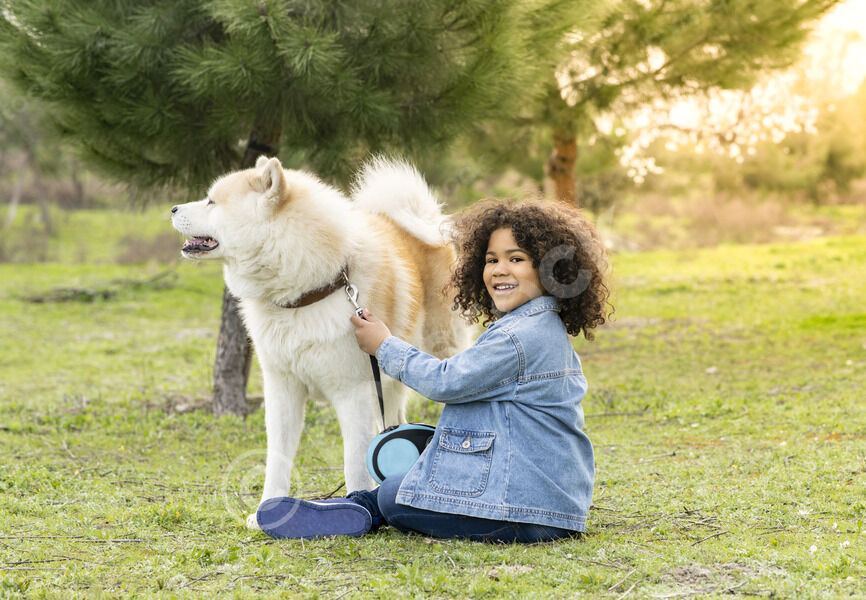 Hispanic boy with curly hair looking away while sitting by dog in nature