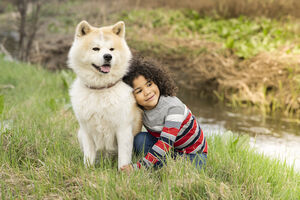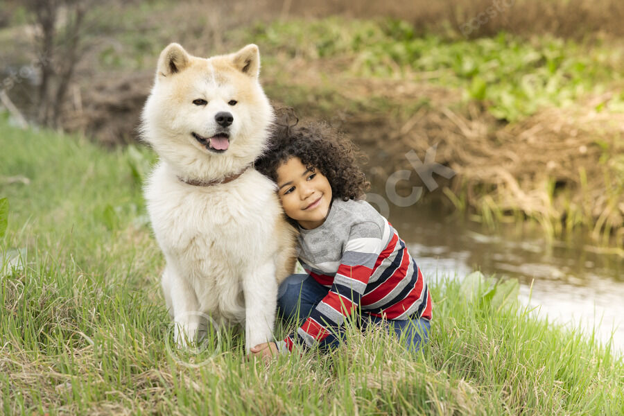 Smiling Hispanic boy with curly hair leaning on dog while sitting on grass in nature