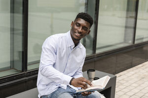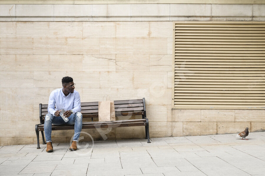 Black woman wearing headphones listening to music looking away while sitting on bench at bus stop in city