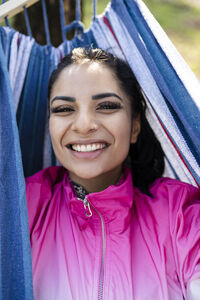 Black woman with closed eyes and hands behind head lying on hammock in sunlit home