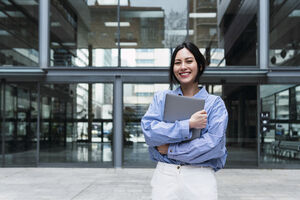 Hispanic woman with braids holding tablet standing in front of building during daytime