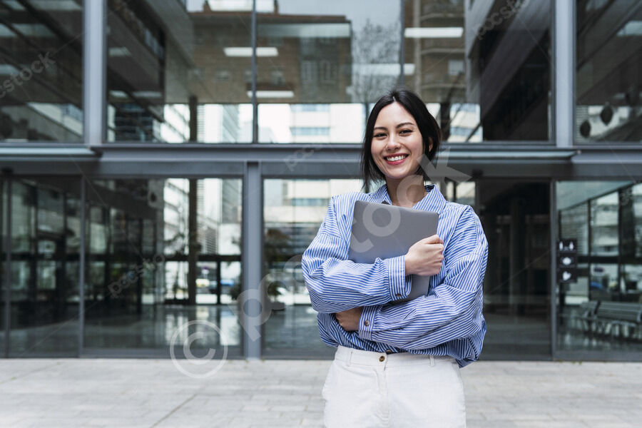 Smiling mixed-race business woman holding laptop standing in front of building in city