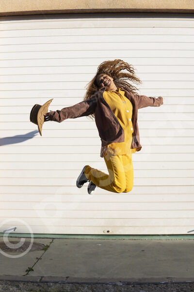 Black curly-haired woman holding cowboy hat jumping against white wall on sunny day