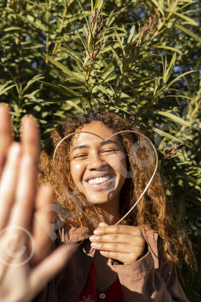Curly-haired Black woman with closed eyes holding heart shaped metal standing in front of plants on sunny day