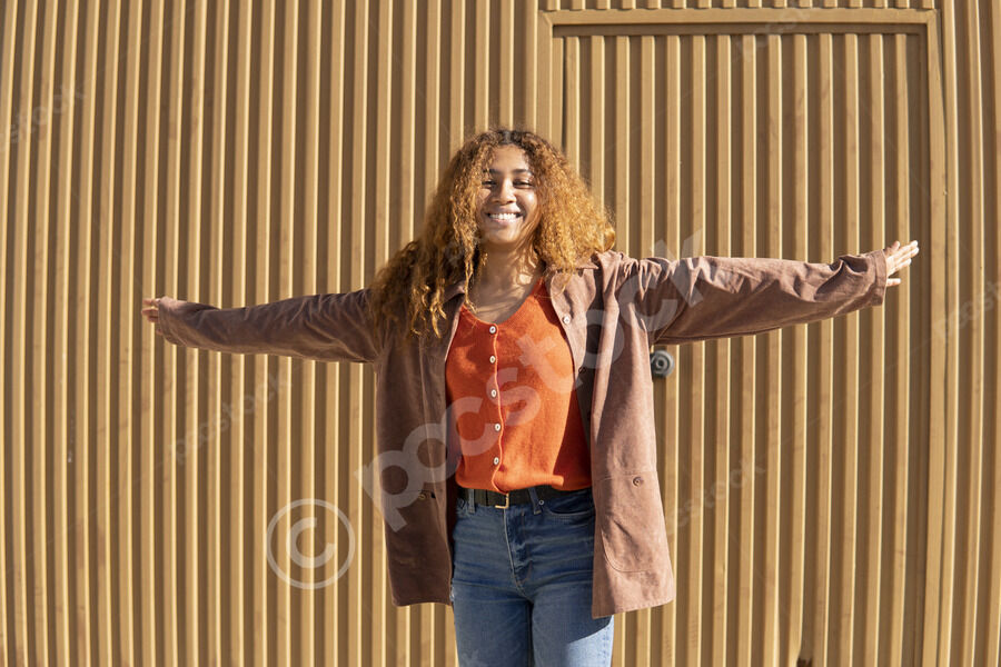 Black woman with outstretched arms standing in front of metal wall panels outdoors on sunny day