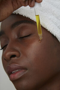 Hispanic woman with curly hair leaning head on hand sitting on sofa at home