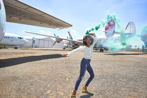 Black woman with vitiligo standing against blue wall outdoors during daytime
