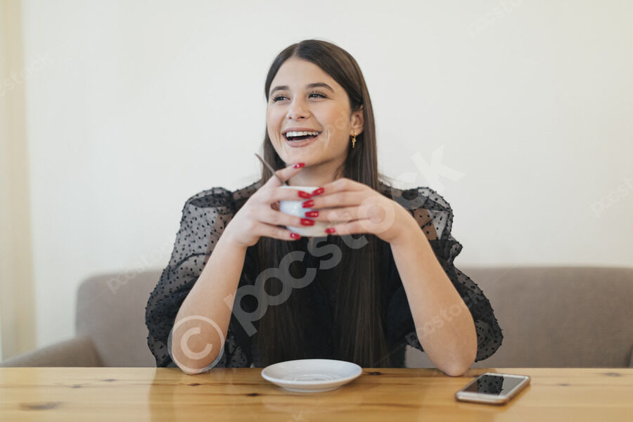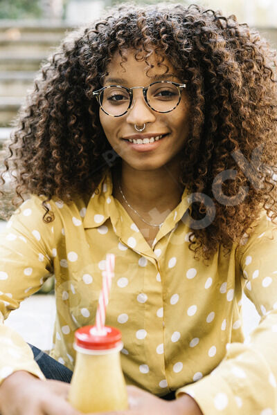 Black woman with vitiligo wearing headphones drinking juice sitting in cafe