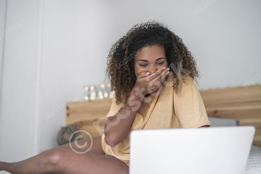 Smiling Black woman with clasped hands looking away while sitting at table with laptop at home