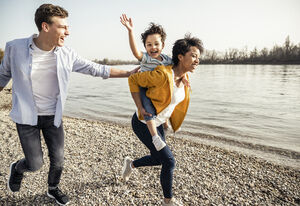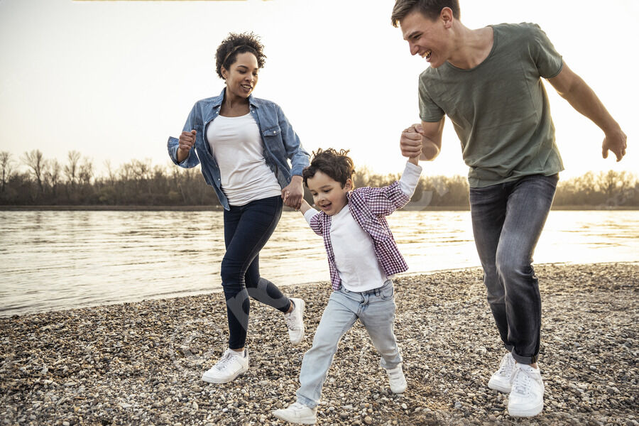 Cheerful Hispanic girl wearing winter clothes holding hand of mother while running on snow in park during winter