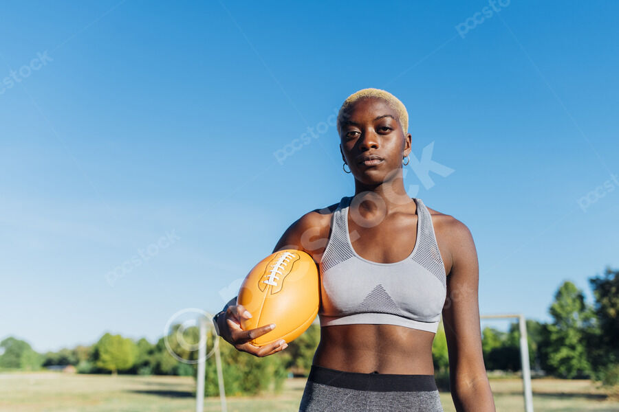 Smiling Black woman with afro wearing headphones and scarf looking away while standing against stone wall outdoors