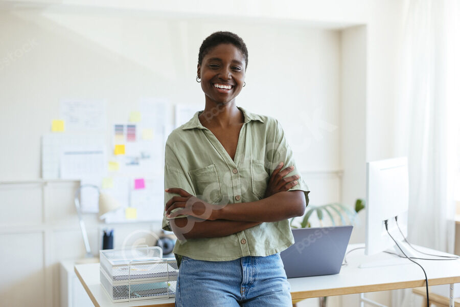 Smiling Black woman with afro wearing scarf and jacket with headphones sitting against glass at bus stop
