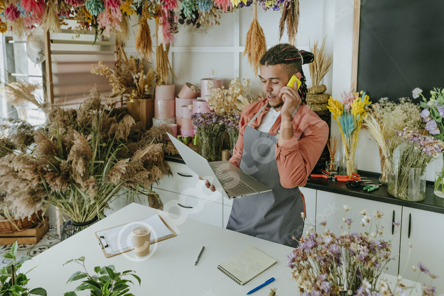 Middle Eastern female teenager with shopping bags wearing hijab looking away having phone call while standing against column in corridor