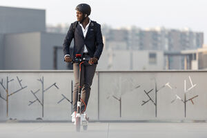 Asian business woman holding smartphone while standing and leaning on railings outdoors on sunny day