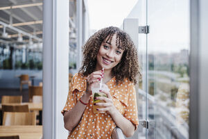 Cheerful Hispanic woman with curly hair holding plastic cup with juice standing and leaning on metal railing in cafe