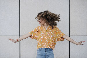 Hispanic woman with outstretched arms tossing curly hair standing against wall outdoors