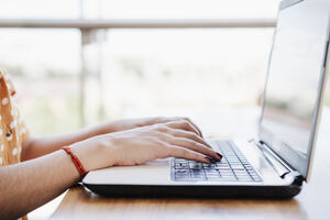 Hispanic woman with curly hair leaning chin on hand using laptop sitting at table with lemon juice on plastic cup in coffee shop
