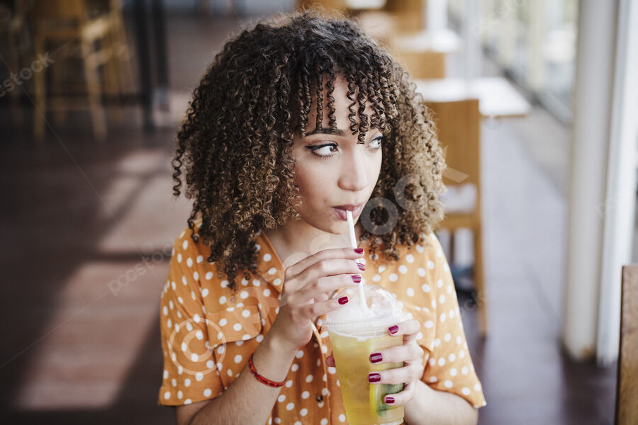 Hispanic woman with curly hair drinking juice from plastic cup looking away sitting at table in cafe